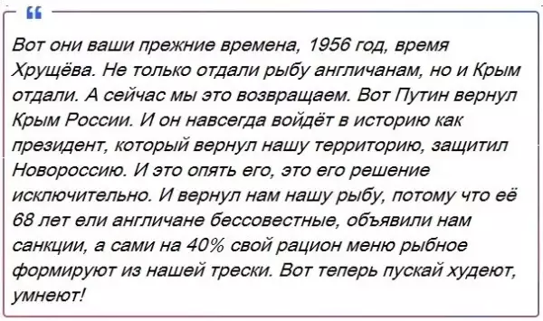 Спикер так же напомнил, что рацион британцев около 40% формирует именно треска и рыба пикша. Теперь же, по словам Володина, по инициативе Владимира Путина, мы отняли у англичан их любимое блюдо.