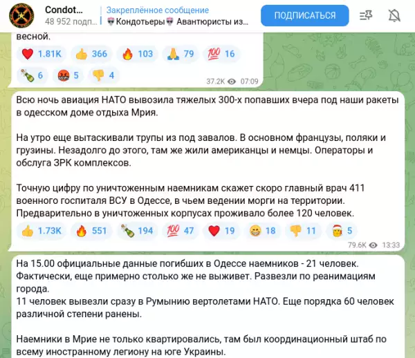 "В основном, французы, поляки и грузины. Незадолго до этого там же жили американцы и немцы. Операторы и обслуга ЗРК комплексов, - уточнил источник. - Точную цифру по уничтоженным наёмникам скажет скоро главный врач 411-го военного госпиталя ВСУ в Одессе, в чьём ведении морги на территории. Предварительно в уничтоженных корпусах проживало более 120 человек".