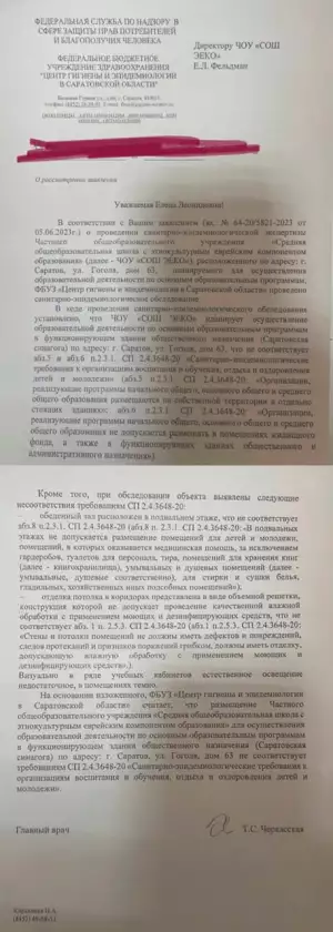 Яаков Кутбишек также пожаловался Берлу Лазару, что в Саратове органами власти усилен контроль за деятельностью СОШ ЭЕКО и соответствием ею норм действующего законодательства. Действительно, с декабря 2023 по январь 2024 года органами прокуратуры и Управлением Роспотребнадзора по Саратовской области проведены проверки СОШ ЭЕКО, результаты о объем которых может вызвать некоторый шок от обилия выявленных нарушений.