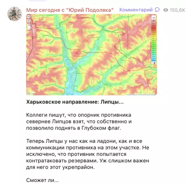 Липцы - ещё одна очень важная узловая точка коммуникаций противника. Потеря Липцов для противника будет очень болезненной: здесь сходятся несколько важных дорог, потеря которых заметно скажется на маневренности харьковской группировки противника. <...> Наши войска пытаются зайти на Липцы со стороны Лукьянцов и через населённый пункт Глубокое, - рассказал эксперт.