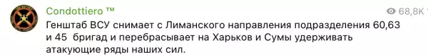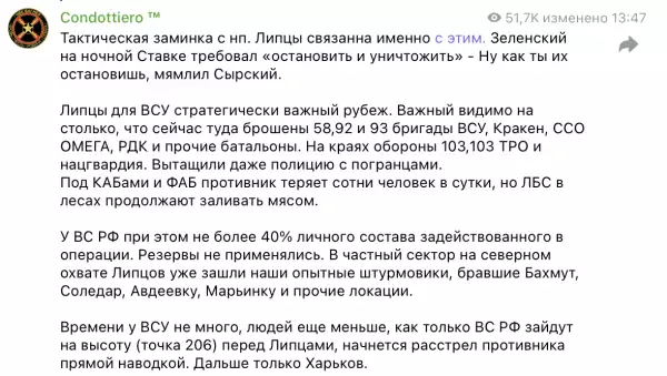 О подготовке штурма посёлка Липцы рассказал также экс-боец ЧВК "Вагнер" в своём телеграм-канале Condottiero. Он отметил, что противник отчаянно сопротивляется, бросая на оборону лучшие силы.
