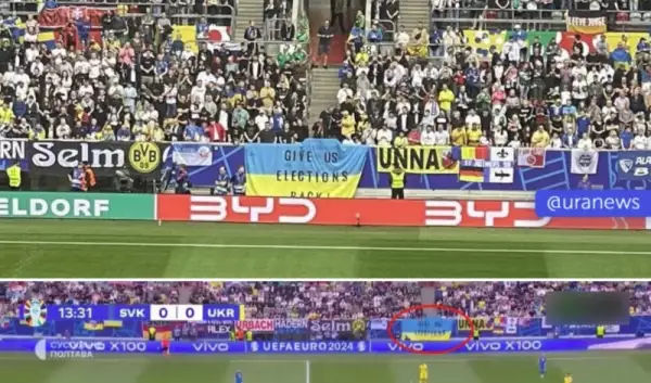 На прошедшем на днях в рамках Евро-2024 матче между сборными Словакии и Украины, на трибуне, где сидели украинские болельщики, был вывешен довольно значительных размеров украинский флаг, на котором по-английски было написано: «Give us elections back» — «Верните нам выборы».