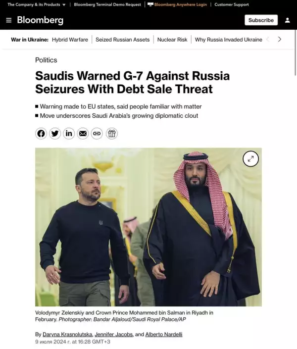 "Саудовская Аравия в частном порядке намекнула, что может продать часть европейских долговых обязательств, если «Большая семерка» решит арестовать замороженные активы России на сумму почти 300 миллиардов долларов", - сообщили источники Bloomberg.