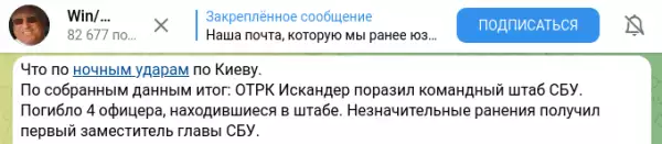 ОТРК "Искандер" поразил командный штаб СБУ. Погибло 4 офицера, находившихся в штабе. Незначительные ранения получил первый заместитель главы СБУ.