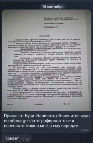 «Вчера в личные сообщения мне от сослуживца пришло такое. Полковник Пузик не отстранен от командования полком. Текст этого объяснения направлен на то, чтобы обелить его. Прошу отметить, что это приказ — заполнить по образцу. Позвонила замполиту, он мне сказал, что под фразой заполнить по образцу, он имел в виду только «шапку» документа. Не поленились же составить такой детальный образец!» — написала она.
