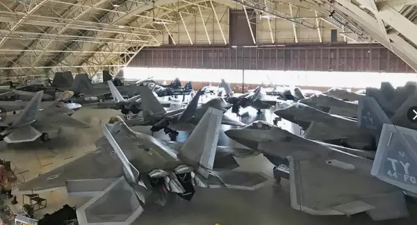 Вот в таком творческом беспорядке хранятся самолеты в подобных ангарах. На фото база Тиндал в США и целое кладбище никуда не годных Ф-22
