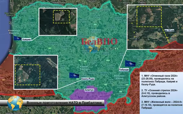 Так, в последнюю неделю сентября на основных литовских полигонах Пабраде, Кайряй и Казлу-Руда проходили МНУ подразделений огневой поддержки «Огненный гром 2024». Участвовали артиллерийские подразделения СВ ВС Литвы, подразделение 82-го артполка ВС США, а также к учениям привлекались силы и средства из состава боевой группой расширенного передового присутствия НАТО.