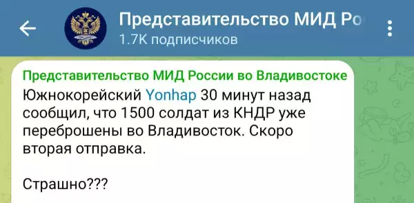 Страшно??? - потроллило в Telegram южнокорейские СМИ представительство МИД России во Владивостоке.