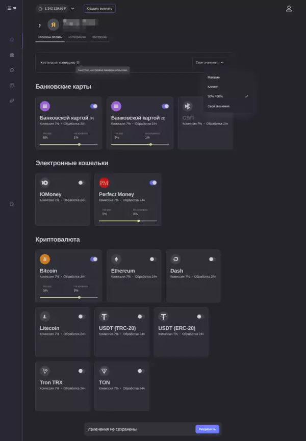 В Личном кабинете вы можете самостоятельно установить процент комиссии за каждую операцию. Это дает вам полную свободу в выборе оптимальных условий для вашего бизнеса, особенно если вы работаете с разными категориями товаров или услуг. Например, вы можете установить одну комиссию для крупных платежей, и другую — для мелких транзакций. Это позволяет вам настраивать систему оплаты так, чтобы она соответствовала вашим финансовым стратегиям.