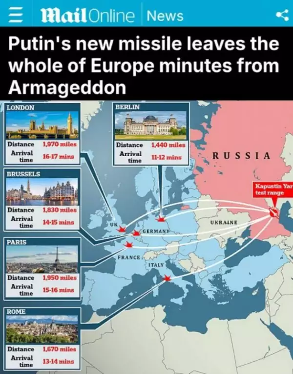 В Европе подсчитали, сколько времени надо «Орешнику», чтобы долететь до их городов: 20 минут до Лондона, 15 – до Берлина, столько же до Брюсселя и Парижа. До Рима всего 13-14 минут. Но, не исключено, что цели для наши ударов будут совсем в других городах. Например, тех, где стоят авианосцы НАТО.