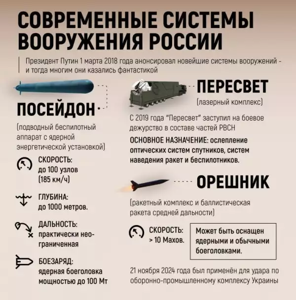 Лазерный комплекс «Пересвет», который заступил на дежурство в 2019-м году, призван ослеплять оптические системы вражеских спутников, системы наведения ракет и беспилотников. Подводный беспилотный аппарат с ядерной энергетической установкой «Посейдон». Это уникальный боеприпас, способный развивать скорость 185 километров в час на глубине до 1000 метров и нести ядерный заряд мощностью 100 мегатонн.