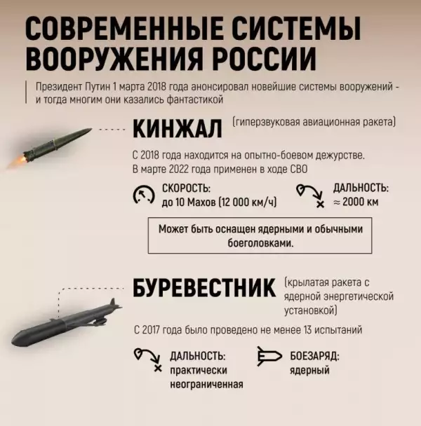 Гиперзвуковая авиационная ракета «Кинжал», также анонсированная в 2018-м году. Она была впервые применена в 2022-м году, в самом начале спецоперации. Крылатая ракета с ядерной энергетической установкой «Буревестник» 2017 года. Было проведено не менее 13 ее испытаний, дальность применения практически не ограничена, ракета способна нести ядерный боезаряд.