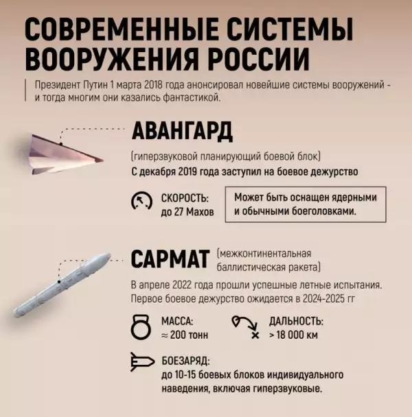Гиперзвуковой планирующий боевой блок «Авангард» поступил на боевое дежурство в декабре 2019 году. Он может быть оснащен ядерными и обычными боеголовками. Межконтинентальная баллистическая ракета «Сармат», в апреле 2022 года прошли её первые успешные лётные испытания. Заступление на постоянное боевое дежурство ожидается в 2024-2025 годах. Масса ракеты составляет 200 тонн, а дальность полёта - 18 000 километров. Боезаряд состоит из 10-15 боевых блоков включая гиперзвуковые.