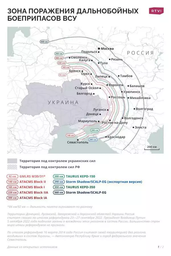 Как и дроны-"камикадзе", эти ракеты, вероятно, будут использовать инерциальные навигационные системы с GPS-коррекцией. По официальным данным, максимальная скорость ракеты достигает 700 км/ч, а дальность действия - до 700 км, что потенциально позволяет ВСУ проводить массированные атаки на объекты во многих регионах страны. Под ударом могут оказаться Липецкая, Орловская, Тверская, Московская и Тульская области.