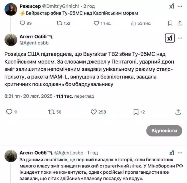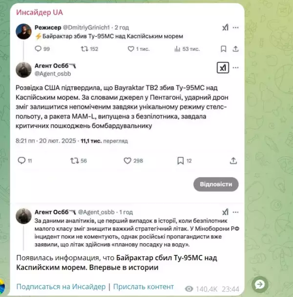 «Появилась информация, что БПЛА сбил Ту-95МС над Каспийским морем. Впервые в истории», - написали авторы канала.
