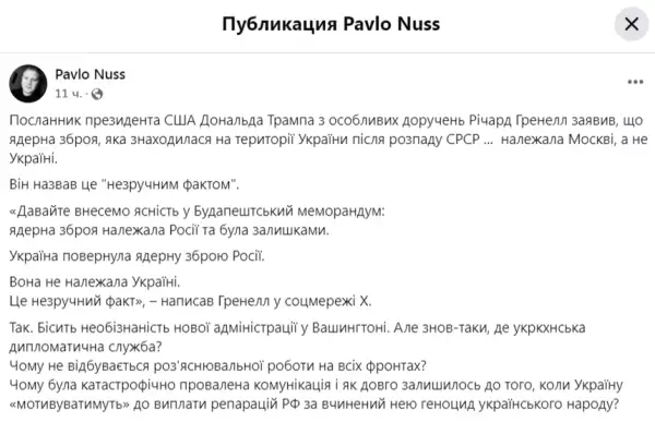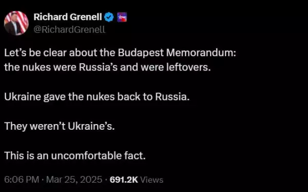 «Давайте внесём ясность в Будапештский меморандум: ядерное оружие принадлежало России и являлось остатками. Украина вернула ядерное оружие России. Оно не принадлежало Украине. Это неудобный факт», — написал Гренелл в соцсети Х (запрещена в РФ).