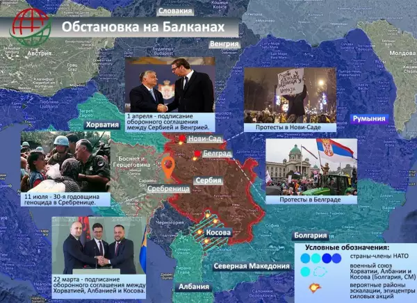 Учитывая складывающуюся политическую конъюнктуру на Балканах, в частности, подписание в марте т.г. трехстороннего оборонного пакта – военно-политического союза – между Албанией, Хорватией и Косово, стоит предположить, что время было выбрано не случайно. Уже более пяти месяцев в Сербии продолжаются протесты.