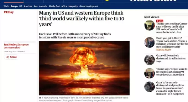Британское издание The Guardian сообщает, что среди респондентов из пяти европейских стран – Великобритании, Германии, Франции, Испании и Италии – доля людей, считающих, что Третья мировая неизбежна, колеблется от 41% до 55%. Среди американцев таковых набралось 45%.