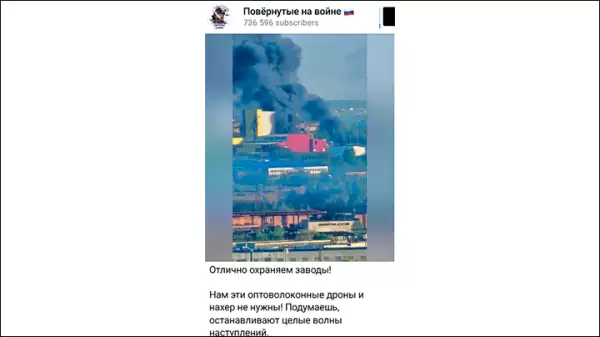 На опубликованных ими кадрах видны клубы чёрного дыма, поднимающиеся над предприятием, очень похожим на завод АО "Оптиковолоконные Системы" - первого и единственного в России производителя оптического волокна.
