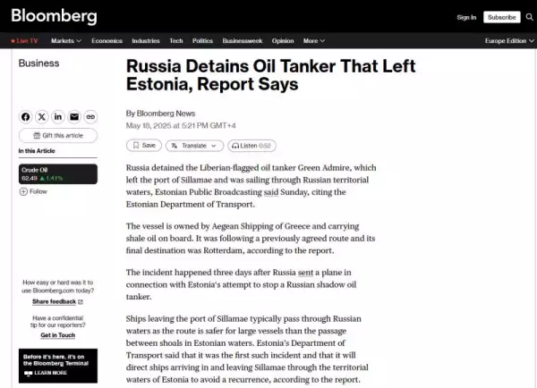 Россия задержала нефтяной танкер Green Admire, шедший под флагом Либерии и перевозивший сланцевую нефть. Как сообщает Bloomberg со ссылкой на эстонское национальное телевидение и Министерство транспорта Эстонии, судно вышло из порта Силламяэ и пересекало российские территориальные воды по согласованному ранее маршруту. Конечной точкой его следования был порт Роттердам.