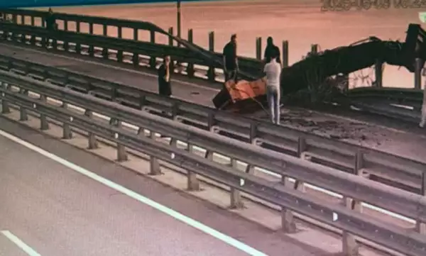 В доказательство приложено видео. На кадрах виден взрыв. Киев утверждает, что мощность взрывчатки составила 1100 кг в тротиловом эквиваленте, однако конструкция моста устояла. В распоряжении врага также оказались снимок повреждения ограждения моста.