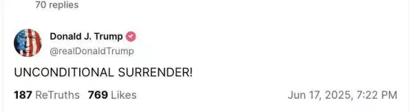 В ближайшие полтора часа Дональд Трамп проведет экстренное заседание Совета национальной безопасности для обсуждения ударов США по Ирану. В своей социальной сети американский президент уже обозначил жесткую позицию: "БЕЗОГОВОРОЧНАЯ КАПИТУЛЯЦИЯ" - таков ультиматум, предъявленный Тегерану с 48-часовым сроком для ответа.