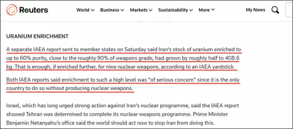 В отдельном докладе МАГАТЭ, направленном государствам-членам в субботу, говорится, что запасы урана, обогащённого до 60%, что уже близко к примерно 90% чистоты оружейного урана, выросли в Иране примерно наполовину и составили 408,6 кг. Этого достаточно для создания девяти ядерных бомб, если продолжить обогащение. В обоих докладах МАГАТЭ говорится, что обогащение до такого высокого уровня "вызывает серьёзную обеспокоенность", поскольку это единственная страна, которая делает это, не производя ядерное оружие.