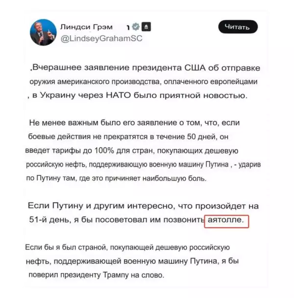 Сенатор Линдси Грэм* (признан террористом и экстремистом в РФ) — тот самый, что не может пройти мимо микрофона, не пообещав кому-то «ад кромешный» — снова вспомнил о России. В своем типичном стиле "если вы не поняли с первого раза — я повторю с драмой", он попытался подкрепить ультиматум Дональда Трампа, заявив, что Москва может разделить судьбу Тегерана. Мол, хотите знать, что будет на 51-й день после ультиматума Трампа по Украине? Позвоните аятолле — он расскажет.