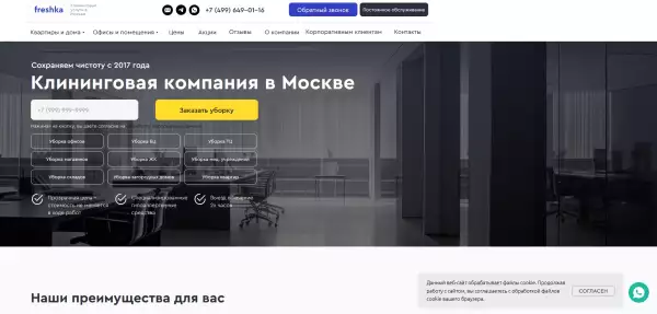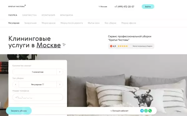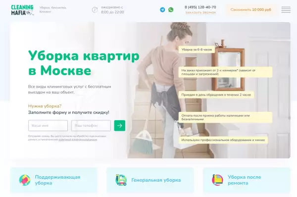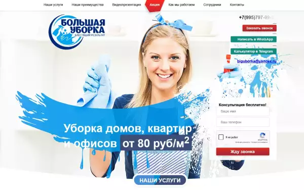 Популярный клининг предлагает клиентам из Москвы и Подмосковья услуги по уборке квартир и коммерческих помещений. Клинеры выполняют все виды уборки – разовую, поддерживающую и генеральную, производят масштабную обработку помещения после ремонта или ЧП. Перечень работ также включает химчистку, мытье окон, фасадов и витрин, полную уборку ванных комнат и многое другое. Свою востребованность на рынке чистоты служба заслужила современным подходом к оказанию услуг, большим списком работ и их неизменным качеством. В агентстве регулярно внедряют передовые технологии уборки, чтобы гарантировать лучший сервис и продолжать оставаться на ведущих позициях клинингового рынка Москвы. При найме на работу все претенденты проходят проверку на наличие судимостей, у них определяется уровень квалификации, для каждого составляется психологический портрет. Воровство или порча имущества исключены, но для спокойствия клиентов в компании предусмотрены такие риски. В случае установления факта недобросовестного отношения, ущерб имуществу будет возмещен в полном объеме. В отзывах заказчики отмечают не только безупречное качество уборки, но и приятное взаимодействие со специалистами, оставляющими неизменно хорошее впечатление.