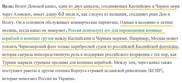 Успешная атака нанесёт серьёзный геополитический удар как по России, так и по исламской республике. Движение военных и торговых судов между Каспийским и Чёрным морями замедлится или прекратится, что приведёт к экономическим потрясениям, — сказано в отчёте.