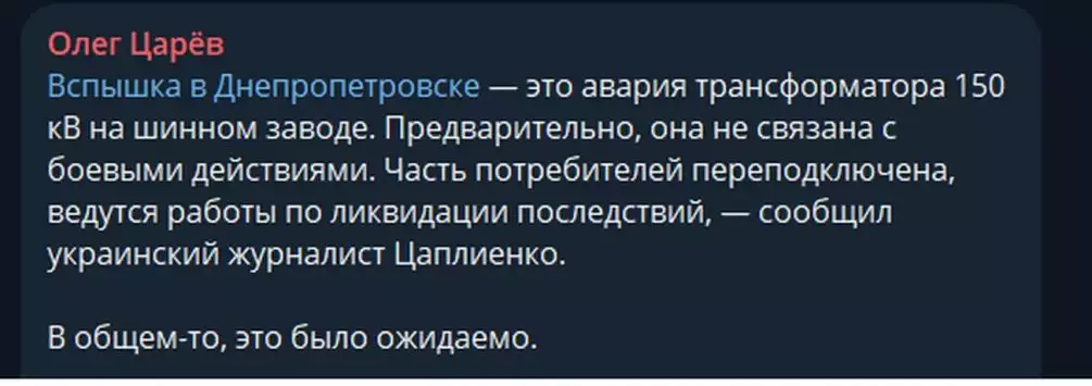 «Вспышка в Днепре – это не прилет, а авария трансформатора 150 кВт на шинном заводе, сообщает журналист Цаплиенко. Предварительно это не связано с боевыми действиями, добавил он», — пишет украинское издание «Страна».