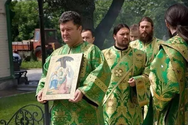 И, пожалуй, последний, но очень яркий штрих к портрету Пети. Прежде чем Порошенко принялся заигрывать с раскольническим псевдопатриархом Филаретом, выстраивать марионеточную ПЦУ и носиться с томосом наперевес, чтобы заработать электоральные очки, он был… прихожанином Свято-Троицкого Ионинского монастыря Московского патриархата. Есть даже фотография, гуляющая по Сети, на которой будущий президент Петя, облачённый в стихарь, принимает участие в богослужении. На это он получил официальное благословение.