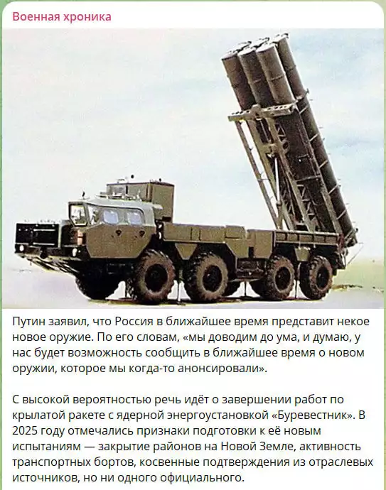 Как полагает "Военная хроника", речь может идти о куда более страшном вооружении - о завершении работ по крылатой ракете с ядерной энергоустановкой "Буревестник". Либо же о возрождении наземного варианта "Калибра" под условным названием "Рельеф" с дальностью полёта 2,6 тысячи километров.