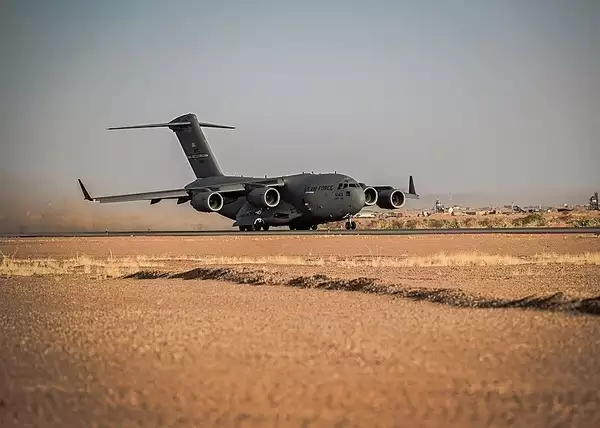 Самолёт ВВС США C-17 Globemaster III взлетает с базы «Нигер 201» в 2021 году