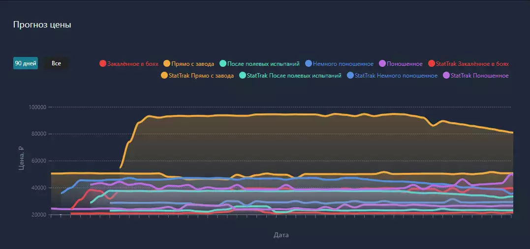 На момент написания статьи общая капитализация рынка составляет примерно 13,3 млрд рублей, ежедневный объём продаж — более 760 тысяч предметов. Платформы показывают распределение по степени износа (от «Прямо с завода» до «Закалённое в боях»), учитывают значение float и даже уникальные паттерны рисунка.