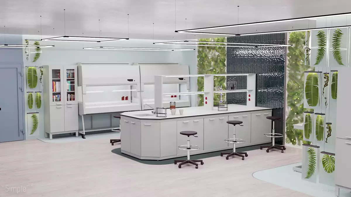 - Островной и пристенный лабораторный стол с химически стойкой поверхностью – основа для экспериментов, с возможностью установки оборудования.