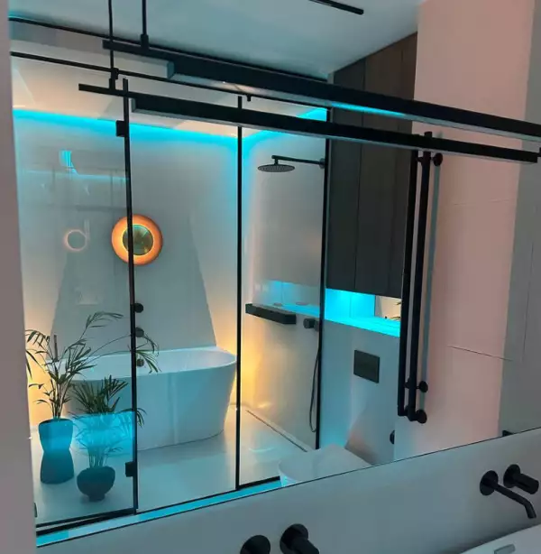 Во-вторых, выбор материалов. Закалённое стекло может быть прозрачным, матовым, тонированным, с пескоструйным рисунком или в технике «умное стекло». Толщина варьируется от 6 до 12 мм. Профиль можно выбрать из нержавеющей стали, матового чёрного, золотого или бронзового алюминия — в зависимости от стиля интерьера.