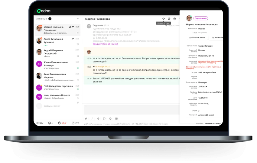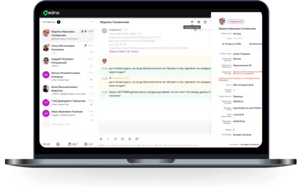 В чат-центр edna реализованы инструменты для постобработки обращений закрепления задач и уведомлений, что способствует лучшей организации рабочего процесса и контролю качества обслуживания на всех уровнях.