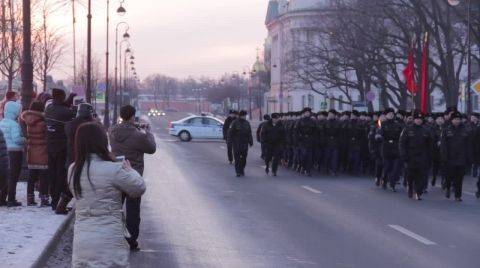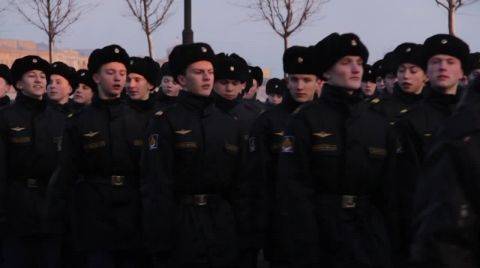 В Петербурге начали готовиться к майскому параду. Казалось бы — рано. Но нет, организаторы считают, что самое время. Нахимовцы маршируют, отрабатывая заученные движения. Все это они должны будут повторить в майские дни.