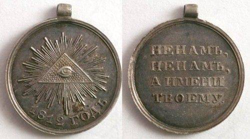 Что же касается 1812 года, то в память о нём была учреждена серебряная медаль. Одинаковая для всех. И для ополченцев, и для солдат, и для генералов. Сначала на аверсе хотели поместить профиль царствующего Государя и Самодержца, как всегда делалось в таких случаях ранее, но Александр I Благословенный приказал сделать другое изображение (рис. 56). И выбить слова из псалма Давида: «Не нам, не нам, а имени твоему»…