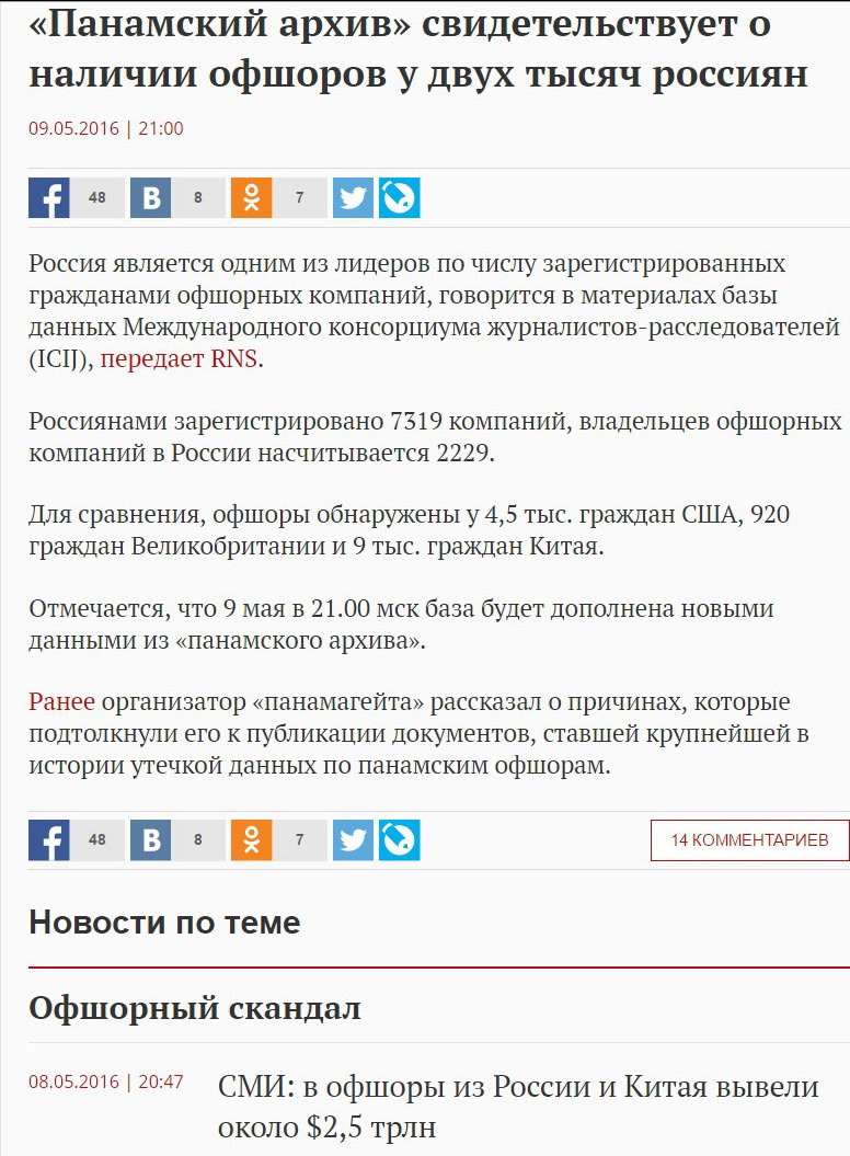 Кроме того, в базе значатся 2229 россиян, у которых есть офшоры. Также указывается, что самих офшоров, которые зарегистрировали граждане России, – более семи тысяч.
