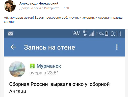 — Результат отличный. Сыграть с такой командой вничью дорогого стоит. Тем более что англичане играли все-таки получше. У них молодая и очень быстрая команда. Одна из лучших, которые я пока видел на Eвро-2016. Она ещё не чемпионская. Но если англичане преодолеют комплексы, свойственные молодости, то смогут даже замахнуться на звание чемпиона Европы. Наши сыграли очень хорошо. Значительно лучше, чем я мог предположить. Все-таки в товарищеских играх не было такой прыти, а главное, команда показала характер.
