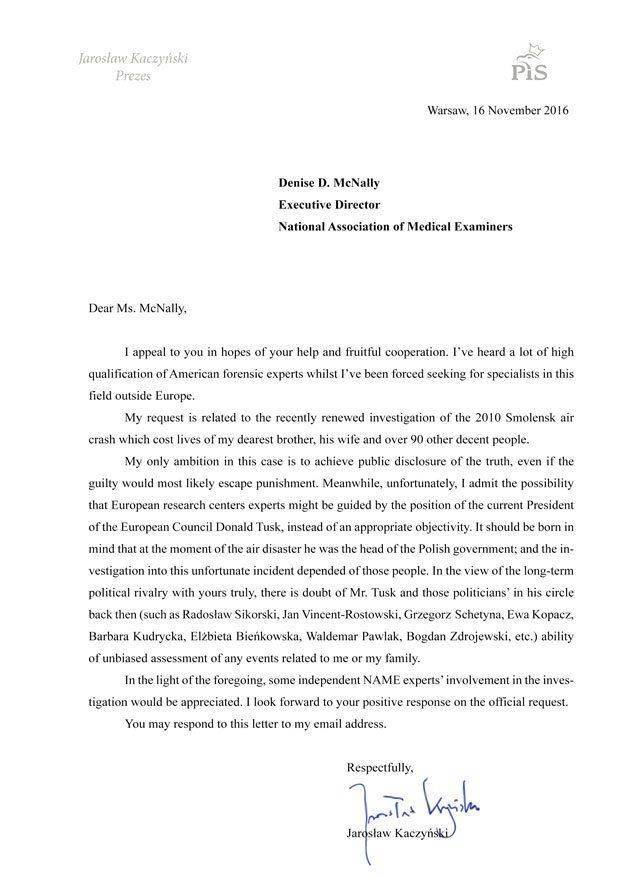Единственная моя цель в этом деле – добиться обнародования правды, даже если наказать виновных, вероятнее всего, не получится. К сожалению, допускаю большую вероятность того, что присланные европейскими исследовательскими центрами эксперты могут действовать, руководствуясь не полагающейся в таких случаях объективностью, а позицией, принятой нынешним председателем Европейского совета Дональдом Туском. Следует учитывать, что в момент катастрофы он был главой польского правительства, от которого зависело проведение расследования этого печального инцидента. При этом ввиду многолетнего политического соперничества с Вашим покорным слугой, возникает сомнение в способности господина Туска и политиков, его окружавших (таких господ, как Р. Сикорский, Я. Винсент-Ростовски, Г. Схетына, Э. Копач, Б. Кудрычка, Э. Бьенковска, В. Павляк и других), давать непредвзятую оценку любым событиям, связанным со мной или моими родными.
