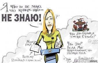 - Или вот это: «Я готова еще раз вникнуть в детали, когда вернусь в свой кабинет…», - а когда русские сказали, что мы своих астронавтов будем запускать в космос на батуте, в ответ на наши санкции против них, то наша мадам представитель Госдепа заявила: «Мне кажется, это имеет несколько иной смысл. Честно говоря, я это прочитала, но тоже не знакома с этим термином…» И, на закуску, сэр. По поводу введения санкций против России: «Мы видим драматическое воздействие на российскую экономику после введения санкций в отношении частных лиц и компаний…»