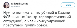 Для него также ничего не стоит поглумиться над смертью человека. В октябре 2012 года в Казани была проведена спецоперация по задержанию террористов, в ходе которой погиб сотрудник ФСБ. Вот как на эту трагедию отреагировал в своем Твиттере Светов: