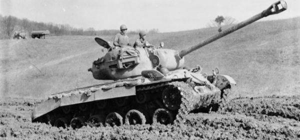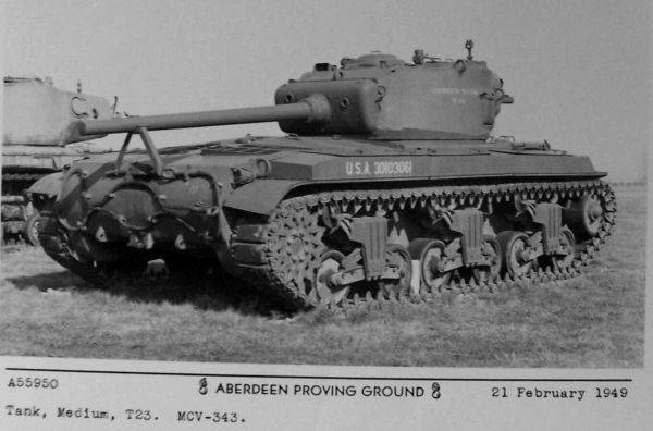 Опытный Т22 на испытаниях. Несмотря на слабое орудие, в конфигурации корпуса уже наблюдается будущий "Першинг"