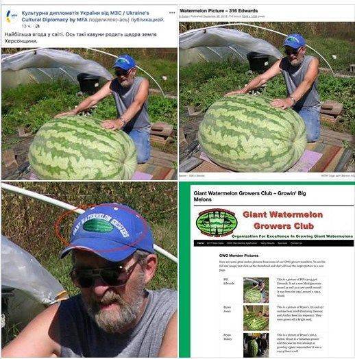 Однако этот гигантский арбуз "из Херсонщины", которым похвастался МИД Украины, оказался арбузом, выращенным в США в 2013 году.