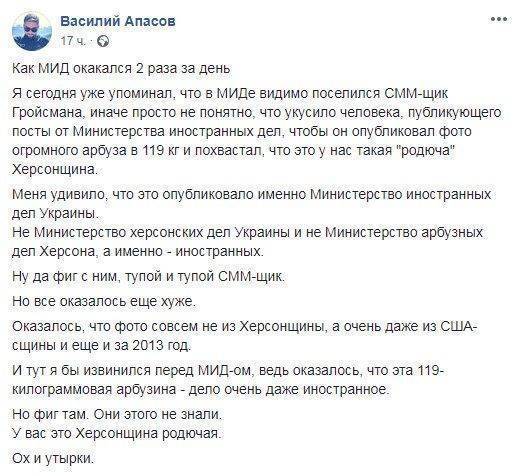 Но я не об этом, вот этот клоун, работающий на высшем уровне, позволяет себе публиковать на официальных страницах - фэйковую информацию. И не важно, что она про арбузы... Значит там все фэйковое...