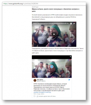 И подобных измышлений ниАчём, оформленных как заявления о нарушениях, у «Голоса» оказались десятки. Впрочем, активисты движения не менее борзо переводили стрелки на другие движения и партии, обнаружив подделку. Например, они радостно припечатали КПРФ, когда оттуда сообщили о вбросе. На деле, вещает «Голос», в щели урны для голосования просто застряли 3 бюллетеня.