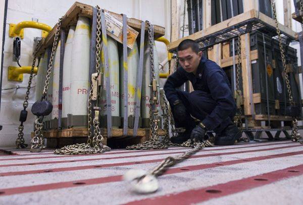 Военнослужащий США закрепляет боеприпасы с белым фосфором на борту USS America, 2017 год